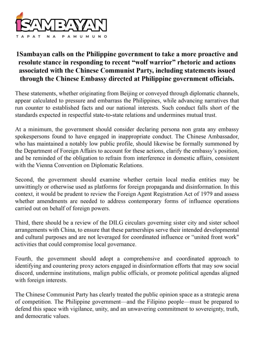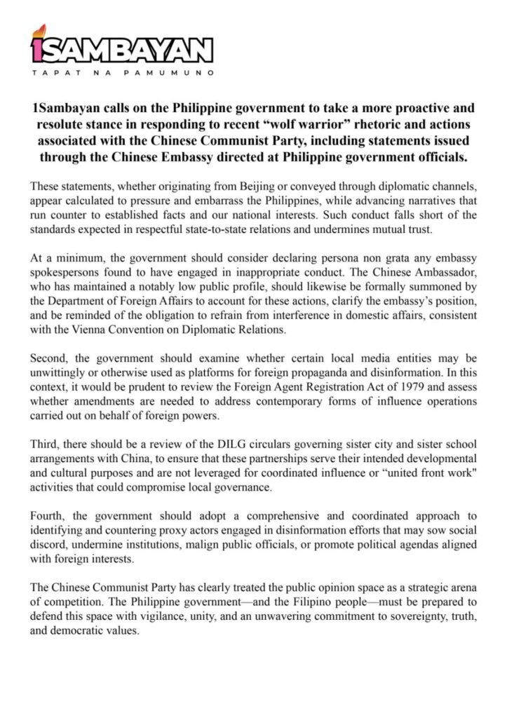 1Sambayan calls on the Philippine government to take a more proactive and resolute stance in responding to recent “wolf warrior” rhetoric and actions associated with the Chinese Communist Party, including statements issued through the Chinese Embassy directed at Philippine government officials.